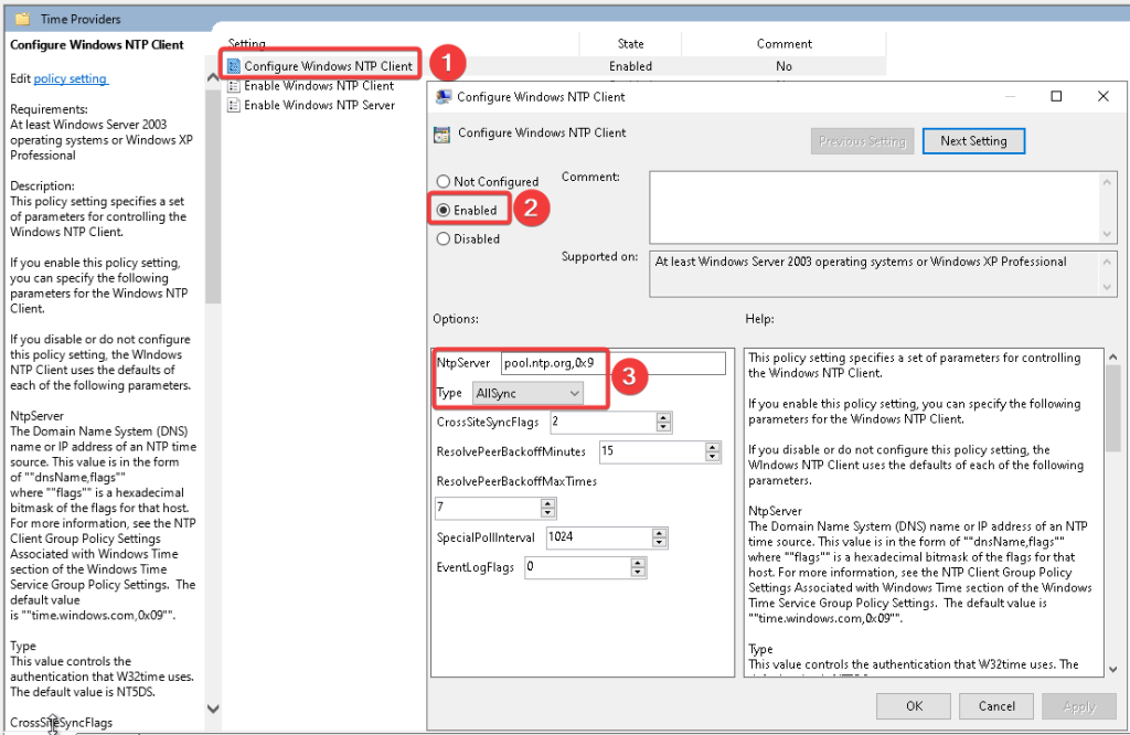 • Set “NtpServer value to what you prefer, keep the 0x9 if you’re using a domain name or change it to 0x8 if using an IP Address