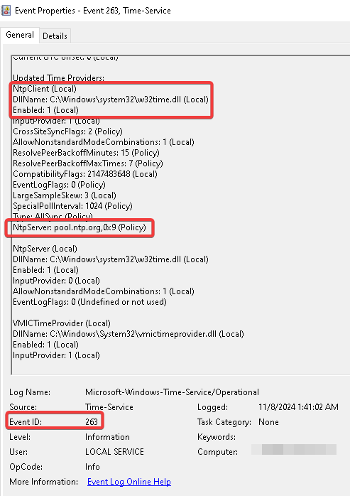 • – Eventvwr.msc – Applications and Services Logs – Microsoft – Windows -Time-Service – Operational
