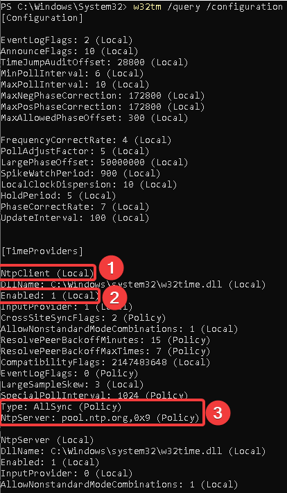 • With w32tm it’s kind of the same w32tm /query /configuration
